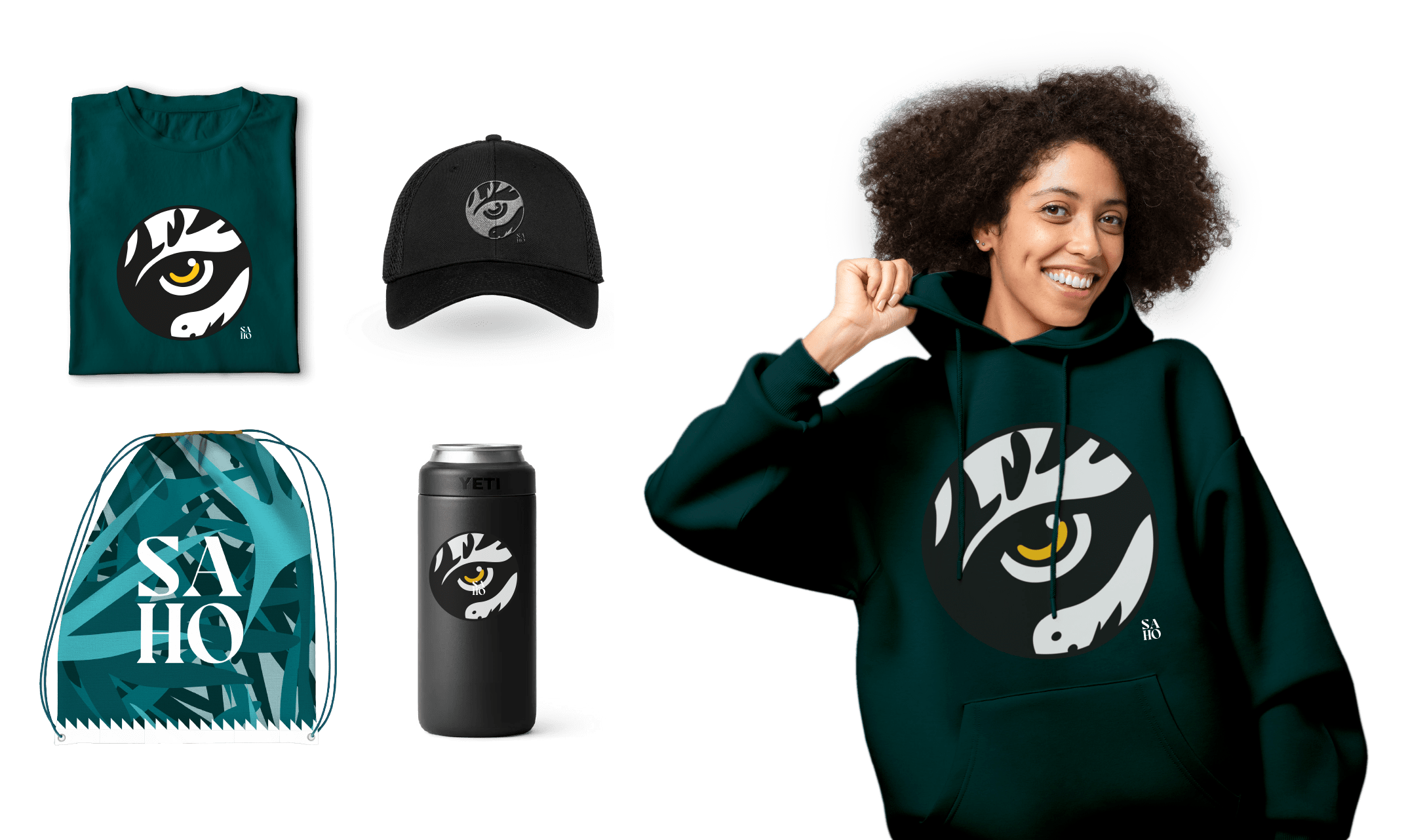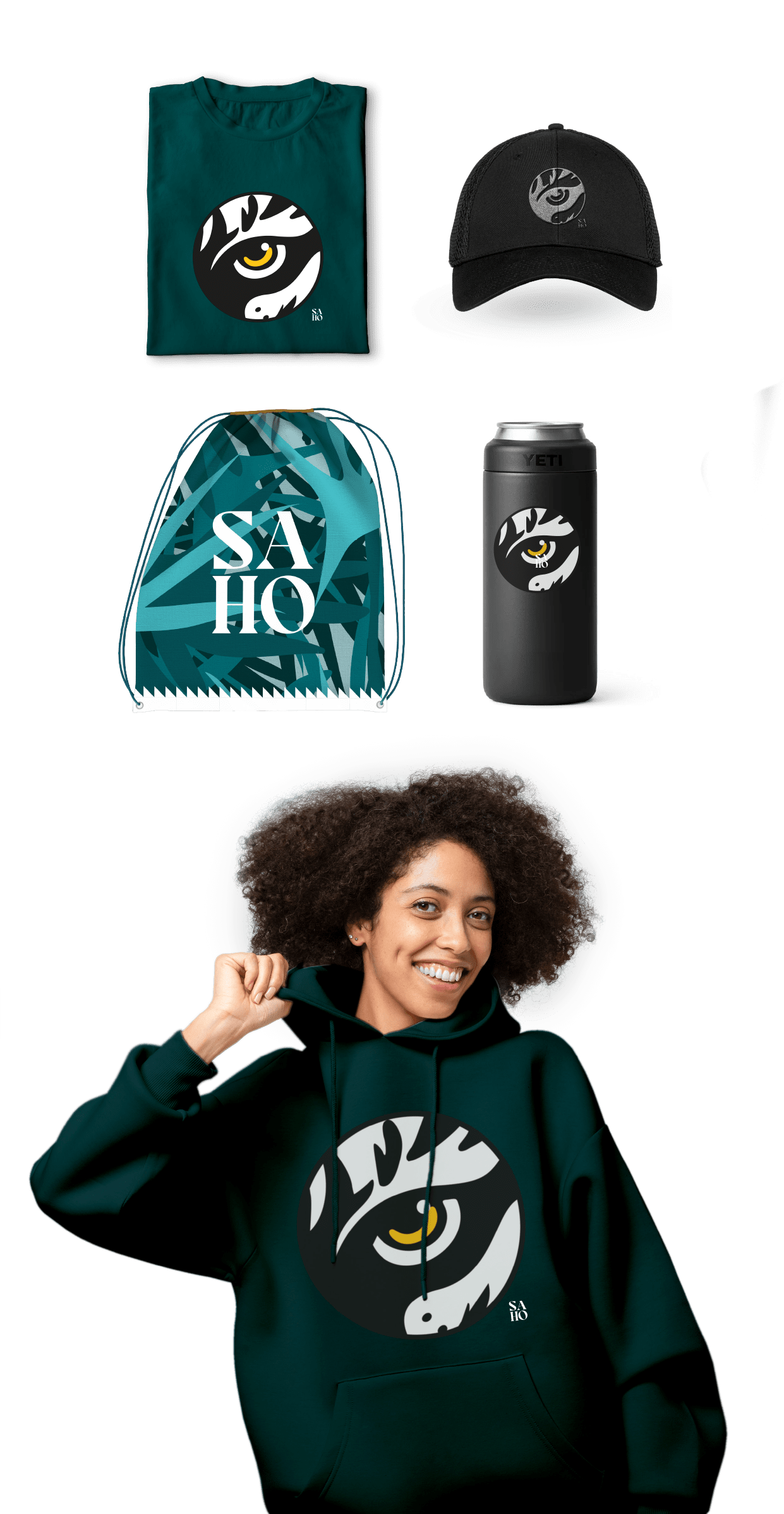 Kernwoorden zijn buiten, samen, levendig. Buiten wordt weerspiegeld in levendige fotografie van mensen in het park, vergezeld van ondersteunende patronen. Levendigheid straalt door lachende mensen die genieten van het moment (je leeft maar één keer). Ook is ons icoon ontworpen om die levendigheid in het merk te belichamen. Dit alles maakt Saho een energiek en levendig merk waar je geen genoeg van kunt krijgen.